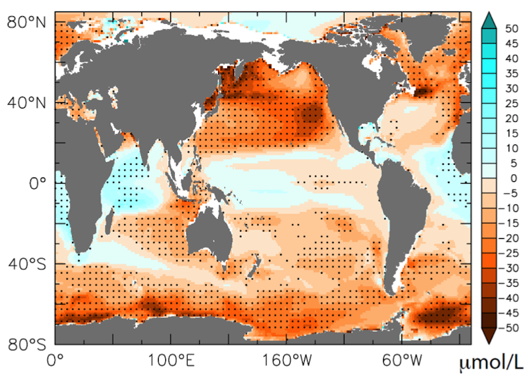Projected oxygen concentration changes at 200-600 meters’ depth in the oceans, comparing model projections for 2090-2099 to 1990-1999. Bopp, L., L. Resplandy, J.C. Orr, S.C. Doney, J.P. Dunne, M. Gehlen, P. Halloran, C. Heinze, T. Ilyina, R. Séférian, J. Tjiputra, and M. Vichi. 2013, CC BY