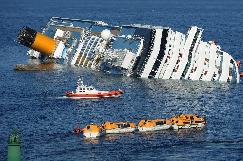 GIGLIO PORTO, ITALY - JANUARY 18: Lifeboats of cruise ship Costa Concordia are towed away on January 18, 2012 in Giglio Porto, Italy.