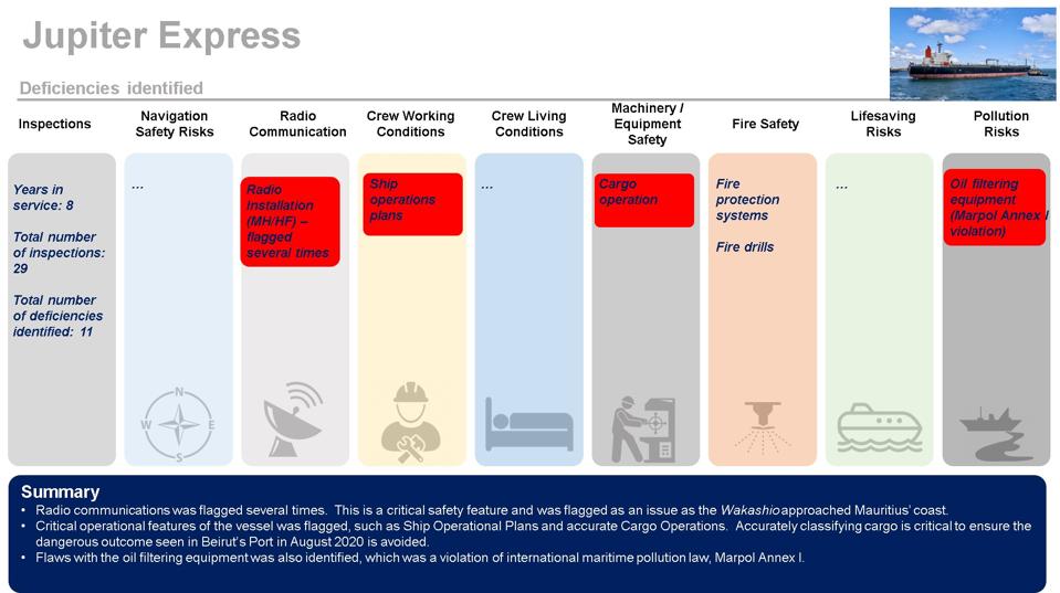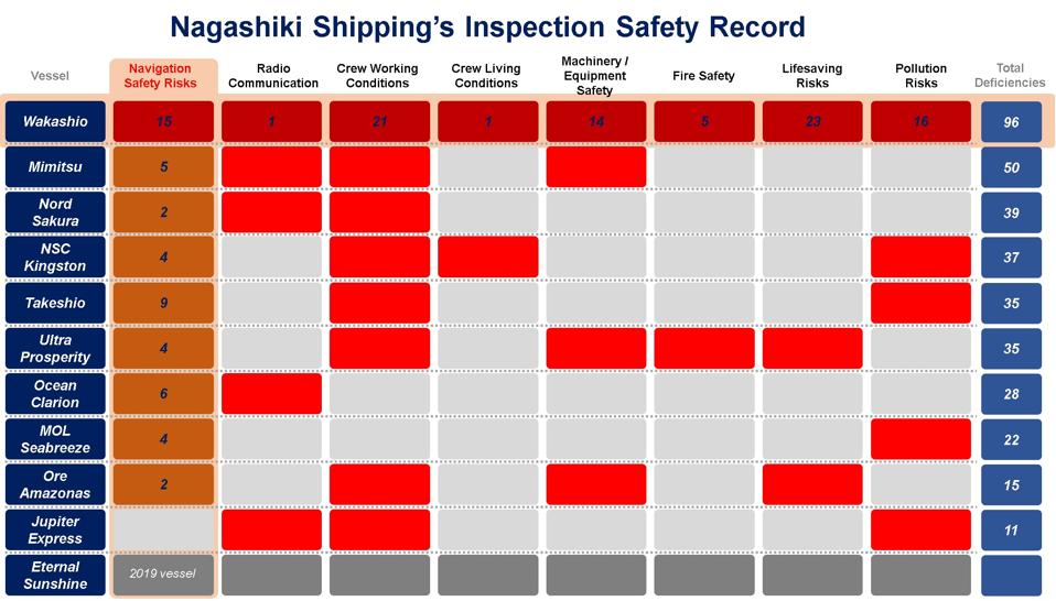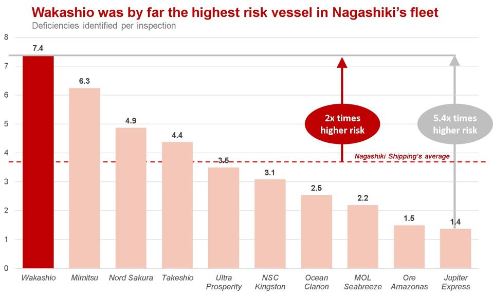 The Wakashio had five and a half times more deficiencies per inspection than the lowest risk vessel, Jupiter Express.