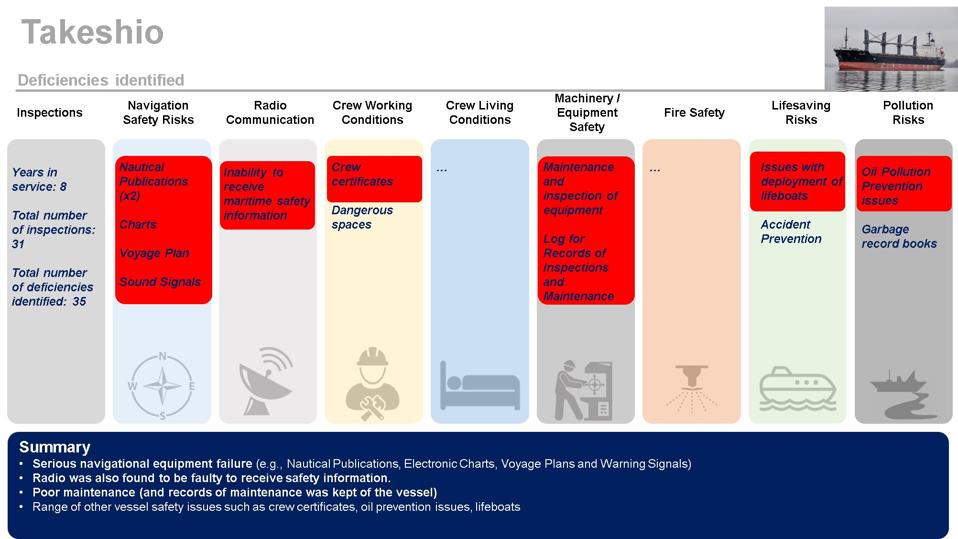 From previous inspections, it is clear that the Wakashio had several serious flaws identified with ‘Safety of Navigation’ risks.