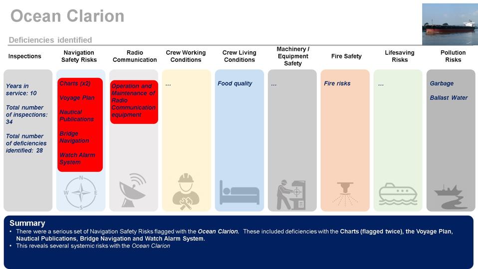 The Ocean Clarion has serious navigation safety risks, such as with electronic charts, nautical publications, voyage plan and bridge navigation