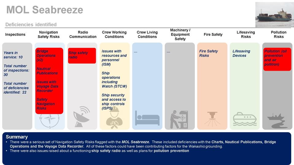 The MOL Seabreeze also had serious navigation issues flagged such as with Bridge Operations, Nautical Publications, Safe Navigation and issues with the Voyage Data Recorder