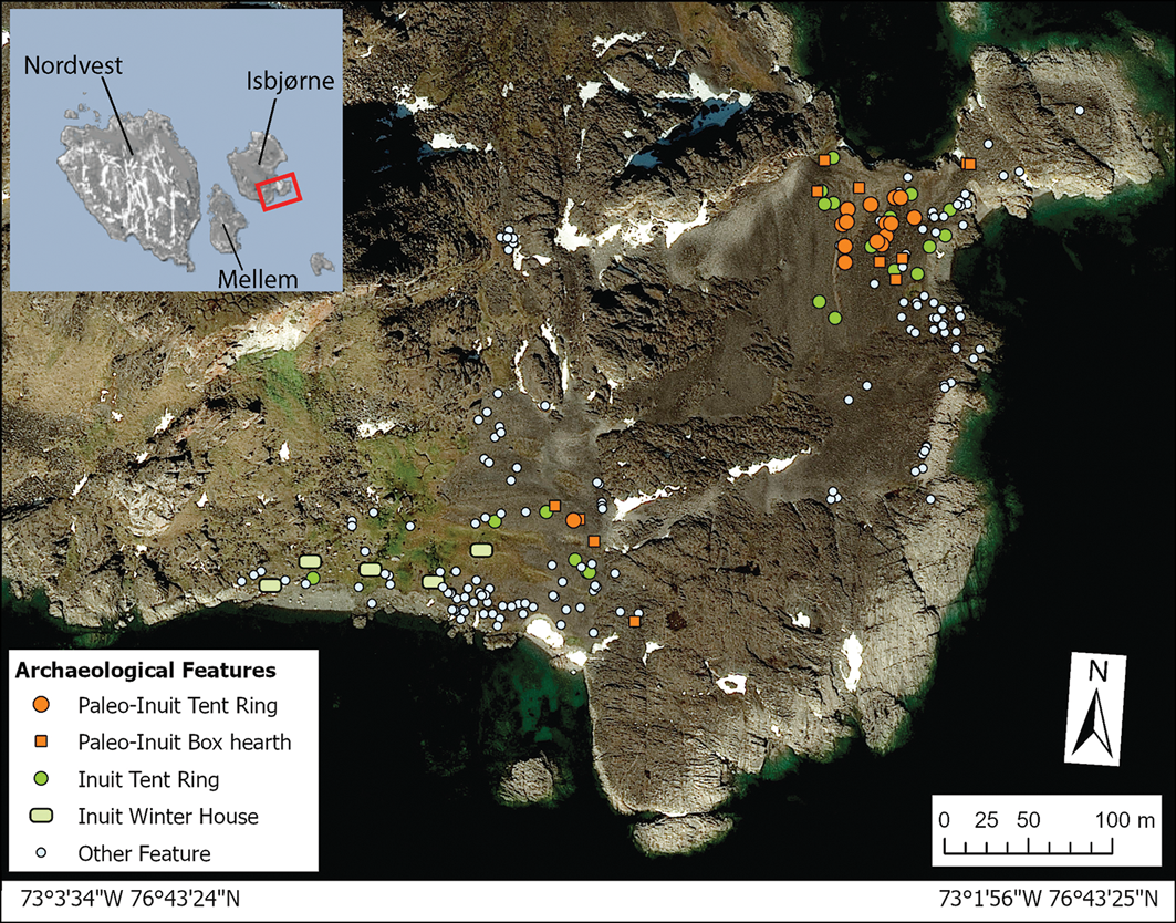 Early Paleo-Inuit features on Isbjørne Island; A) location of site