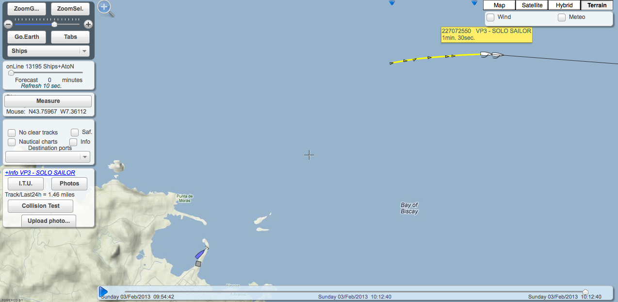 Racing without a keel for a week now, at 2100hrs French time (2000hrs UTC) this Wednesday evening Dick made the decision to seek shelter and anchor in the bay at San Ciprián, and so avoid the strong gale force winds which are about to sweep the Bay of Biscay especially between Thursday and Friday.