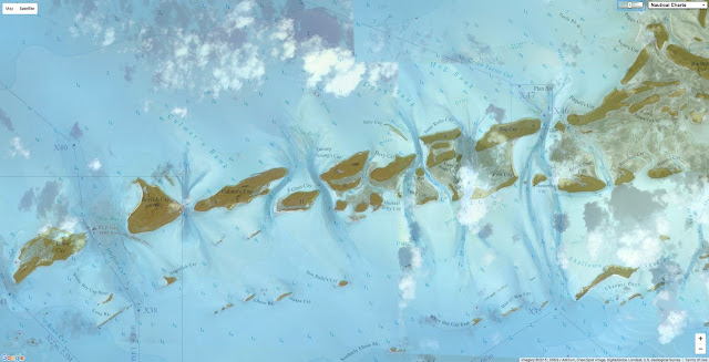 The darker blue sections are the deepest parts of the channels, where the water flow has cut through the rock ridge that makes the line of cays.