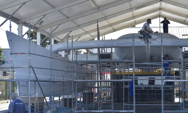 The multi-hulled catamaran is in a shipyard at Saint Malo on France’s west coast, awaiting the installation of solar panels, wind turbines and electrolysis equipment, which breaks down water to produce its component elements, hydrogen and oxygen.