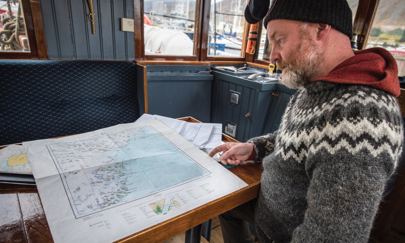 A naval architect turned explorer, Siggi navigates by scanning aerial photos and uploading them into a plotter, the ship’s electronic navigation system.