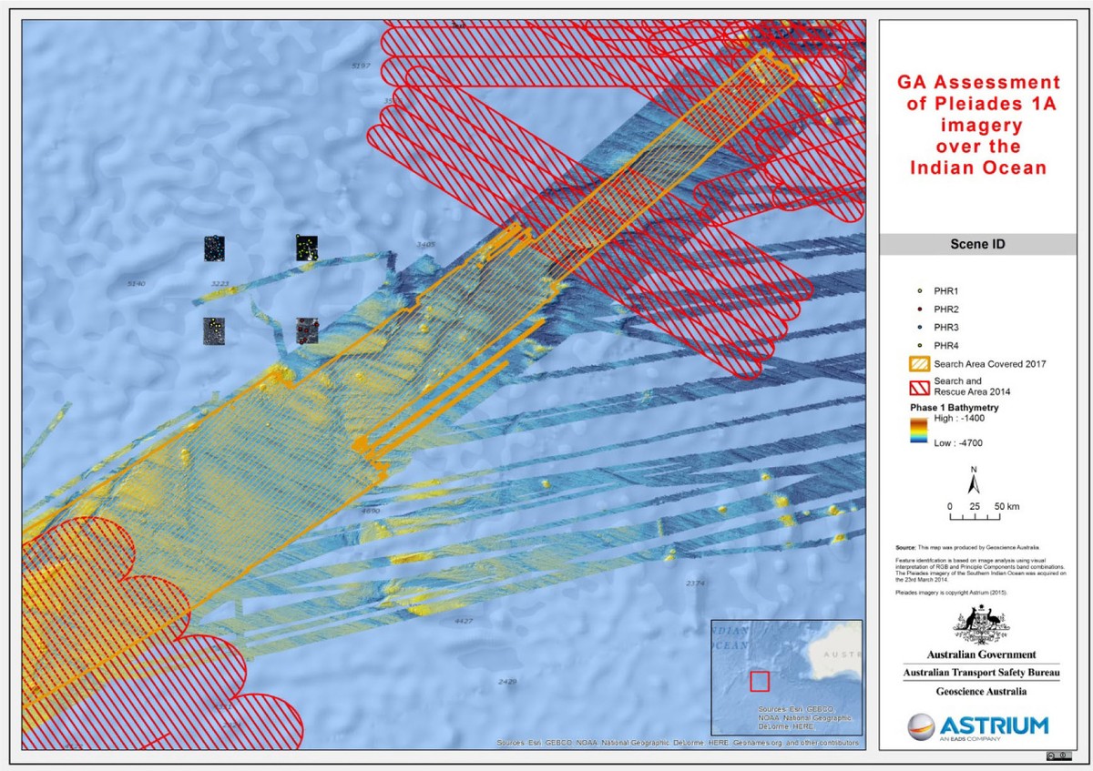 - Geoscience Australia : detailed analysis of four images captured by the PLEIADES 1A Earth-imaging satellite on March 23rd, 2014, not long after the March 8th disappearance of the plane