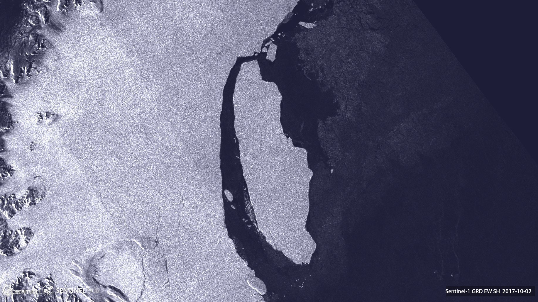 Larsen Ice Shelf, Released 06/10/2017 10:00 am Copyright contains modified Copernicus Sentinel data (2017), processed by ESA The Copernicus Sentinel-3A satellite takes us over the Antarctic Peninsula and the adjacent Larsen Ice Shelf, from which a massive iceberg broke off in July. The image has been manipulated, so clouds appear pink while snow and ice are blue to help us differentiate between them.