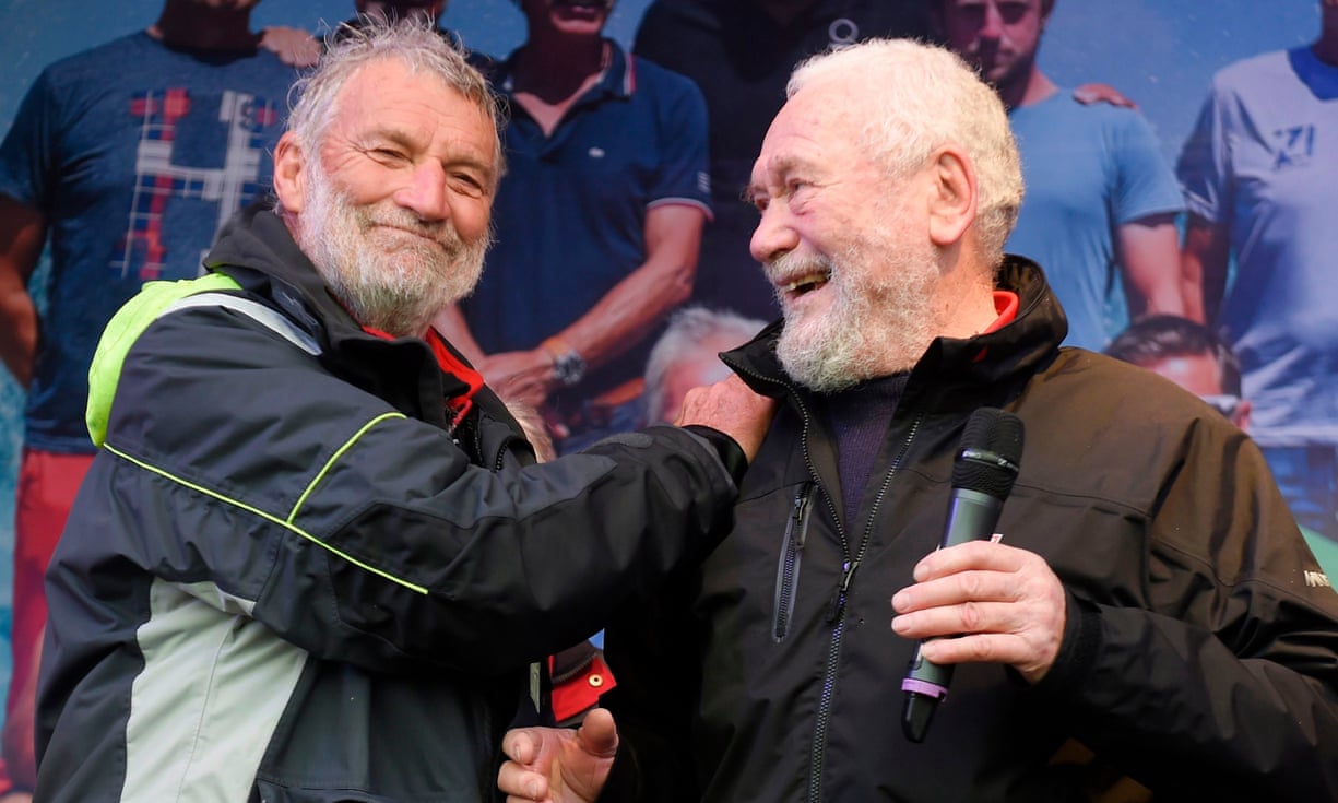 Jean-Luc Van Den Heede (left), is congratulated by Robin Knox-Johnston,