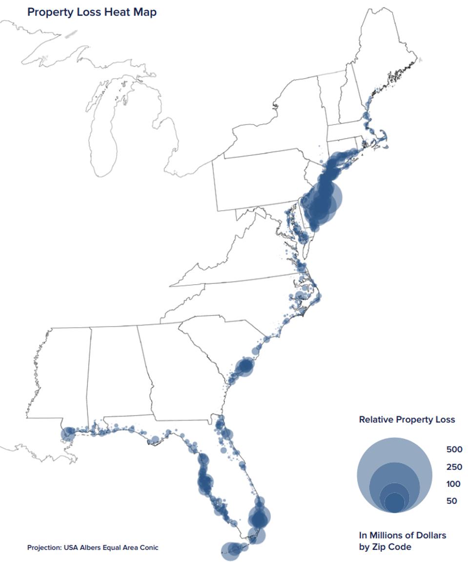 The First Street Foundation's Heat Map showing projected property losses on the East and Gulf Coasts.
