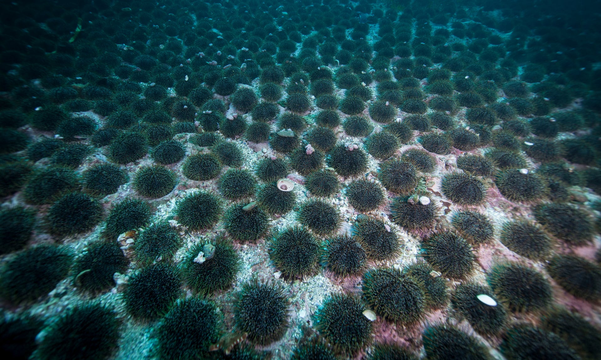 The bare rock is overgrazed by sea urchins, or kina, which flourishin the absence of snapper and crayfish, their natural predators.