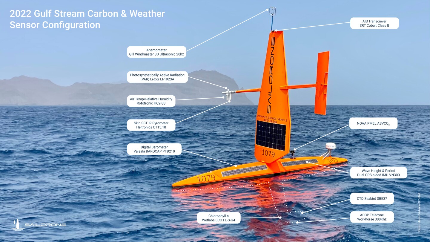 Graphic showing details of the sensors on the Saildrone Explorers in the 2022 Gulf Stream mission