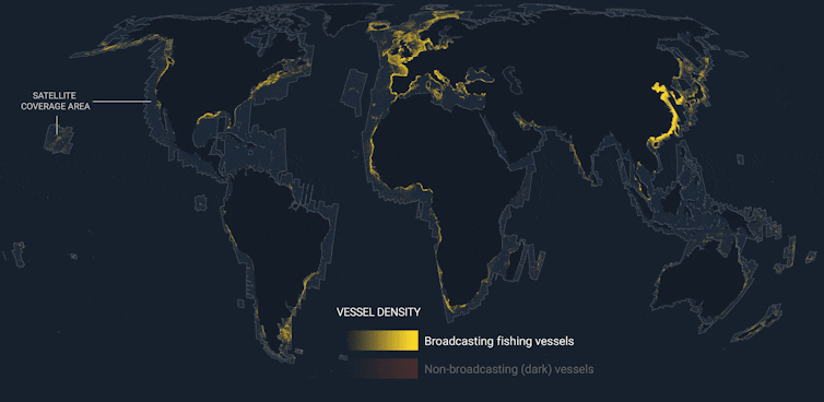 On this 2022 map, vessels that publicly broadcast their GPS position via the AIS system are shown in yellow, and those that do not broadcast but have been detected via satellite imagery are shown in orange.