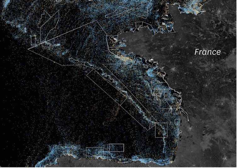 Example of industrial fishing vessels tracked by AIS (in blue) or not tracked (in beige) along the French Atlantic coast, based on data from the NGO Global Fishing Watch.
