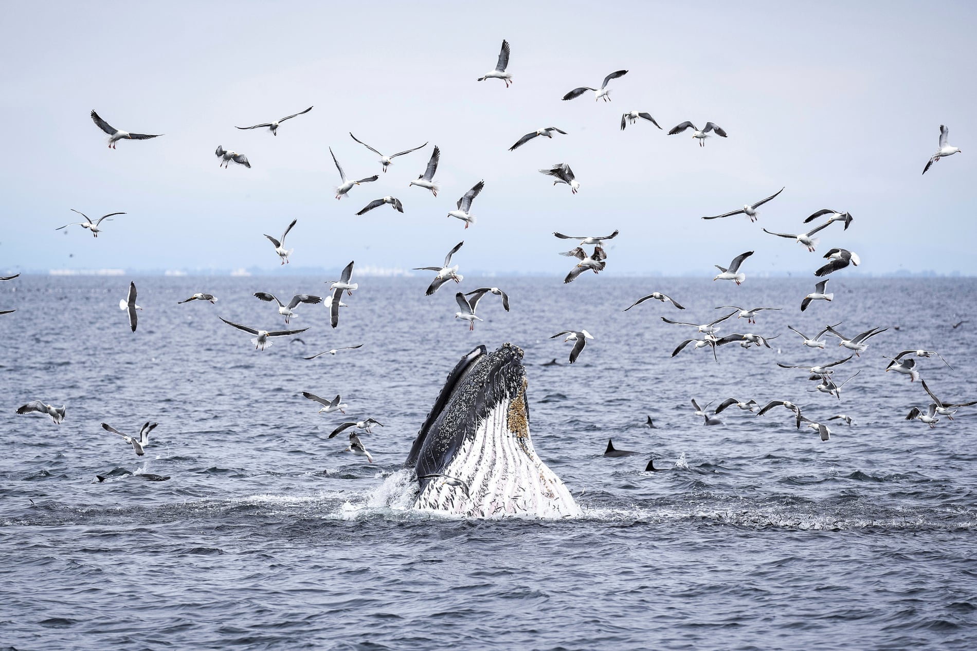 A humpback whale, dolphins and sea birds feed on a school of fish in the Channel Islands on 1 May 2025.
