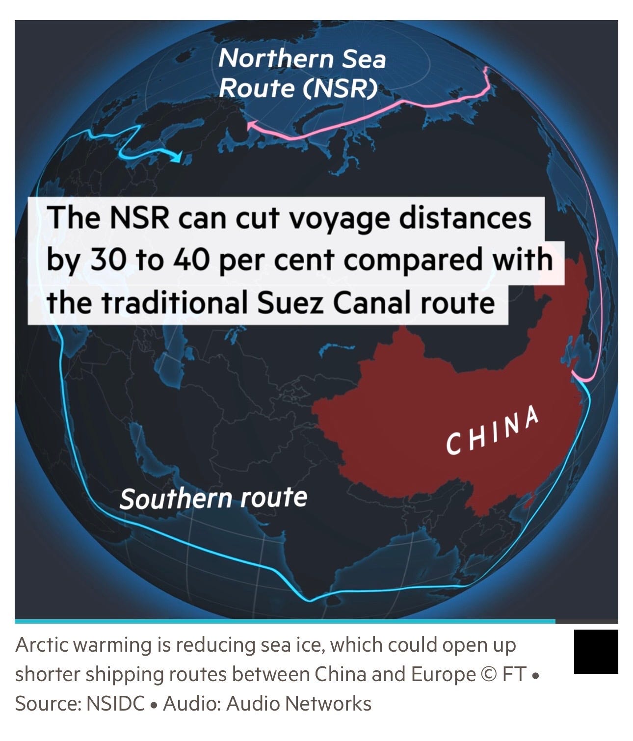 The core argument is geographic: Arctic routes, particularly via Russia’s Northern Sea Route (NSR), can cut voyage distances between northern China and northern Europe by 30–40% compared to the Suez Canal corridor.