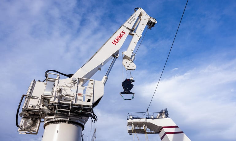 Completing the quartet is a multi-purpose offshore crane on the starboard side, specified with active heave compensation and configured for deep operations down to around 2,500 meters.