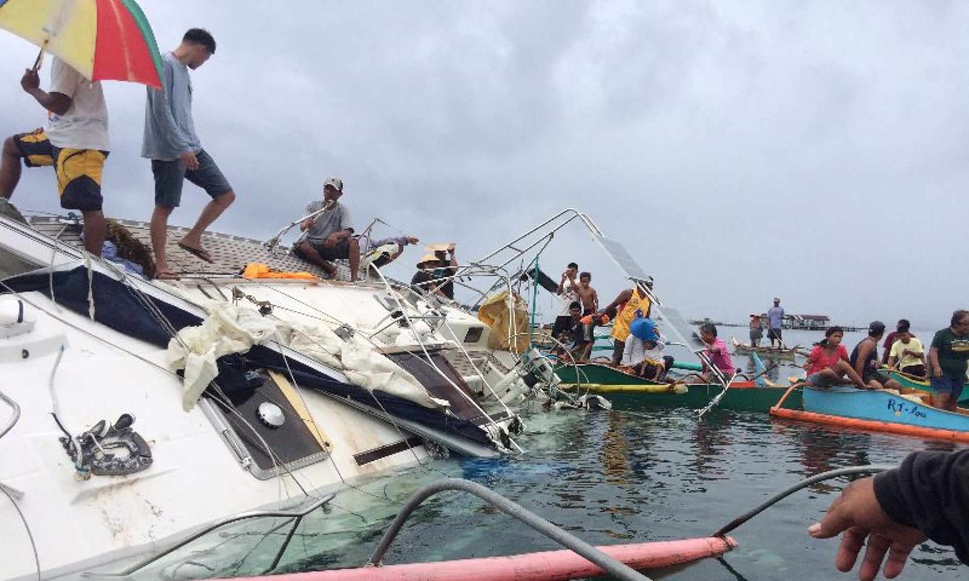 Filipino fishermen recovering the drifting yacht off Barobo town.